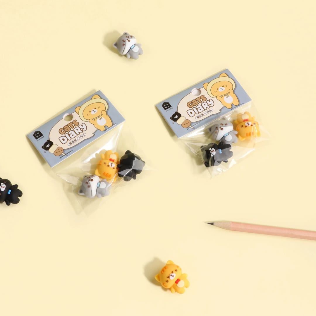 Tiny paws, big charm the cat’s diary eraser set features three adorable kitty-shaped erasers in orange, black, and grey the perfect companions for your pencil pouch or journal.